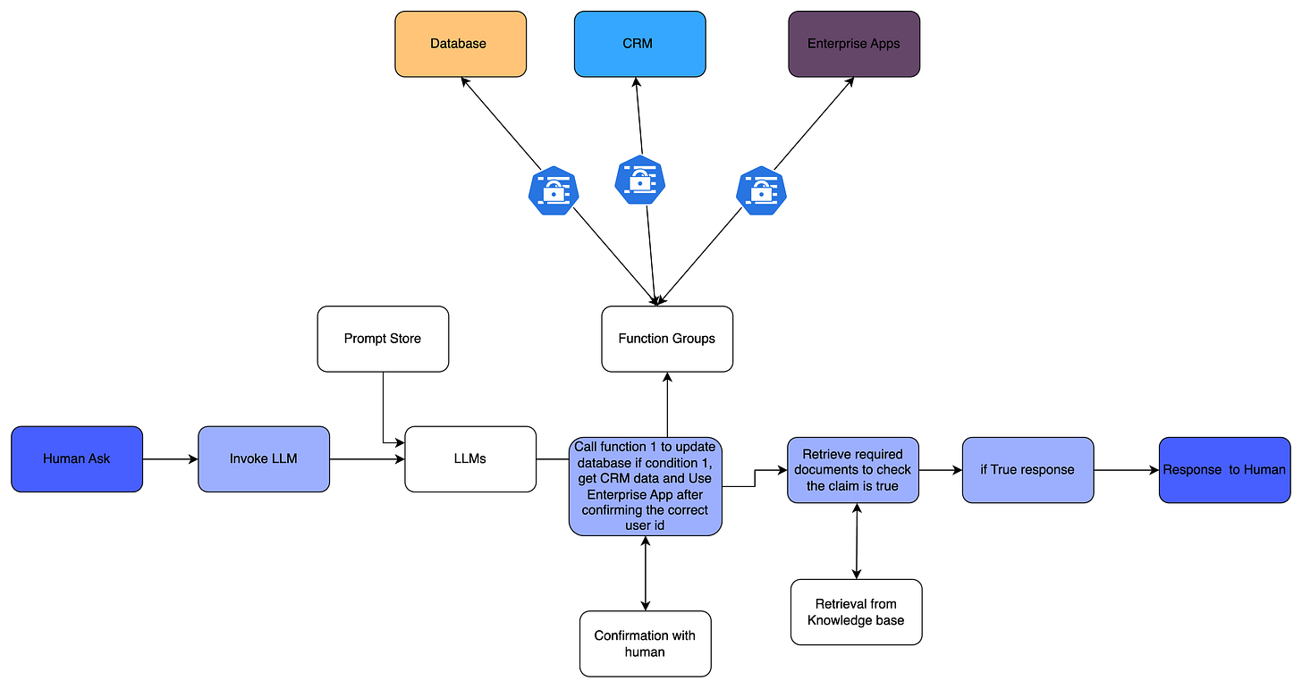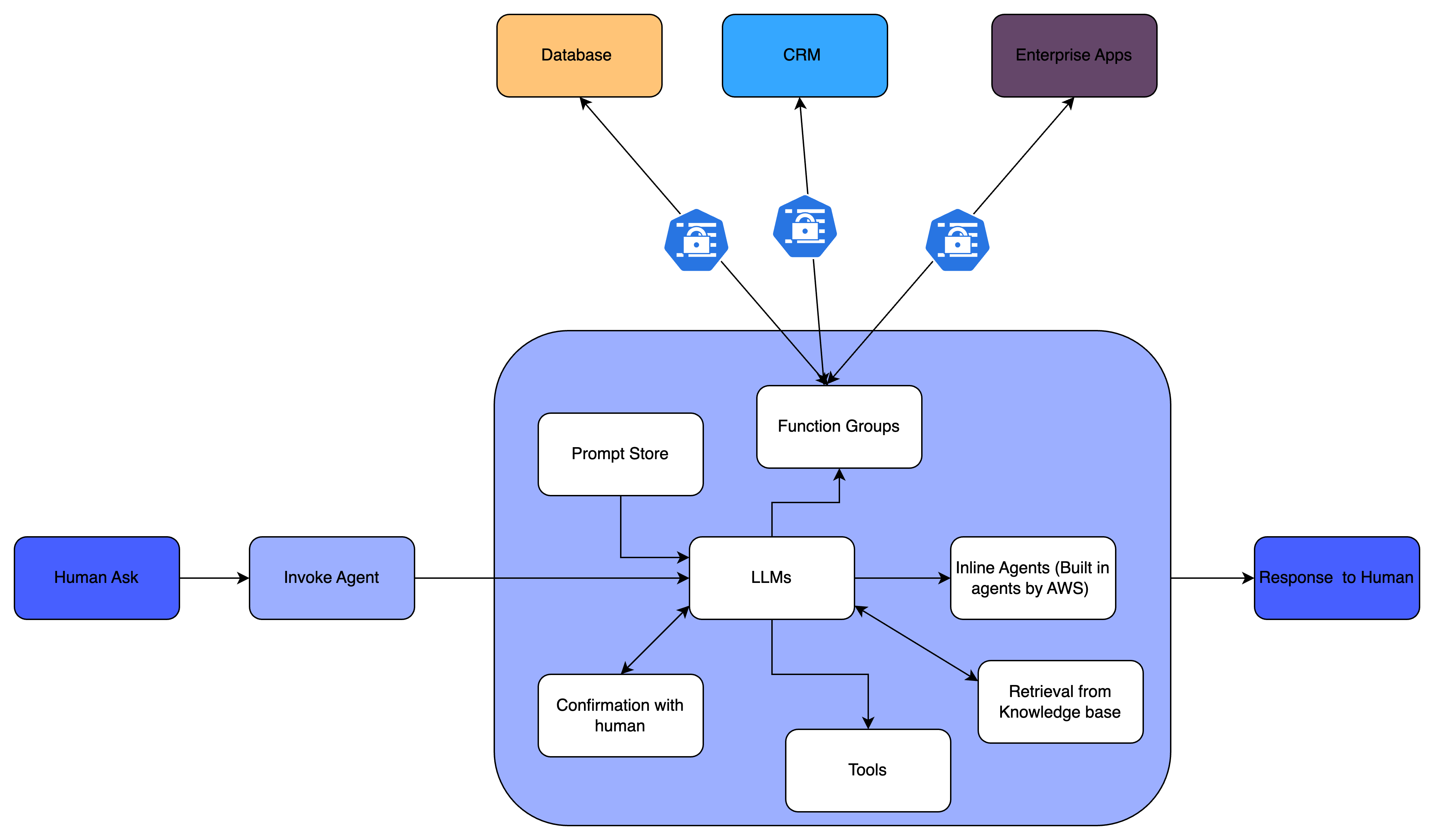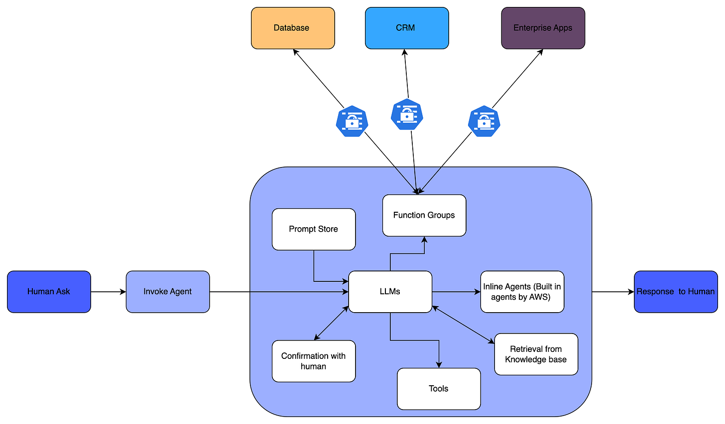 In the above diagram, if you do not have that Lambda (Function to achieve goal) ** which performs a task for you independently, then this whole diagram just supports knowledge base and RAG question answering. Even with all this, if you do not implement and achieve the task without human intervention, then it is not qualified as an Agent.